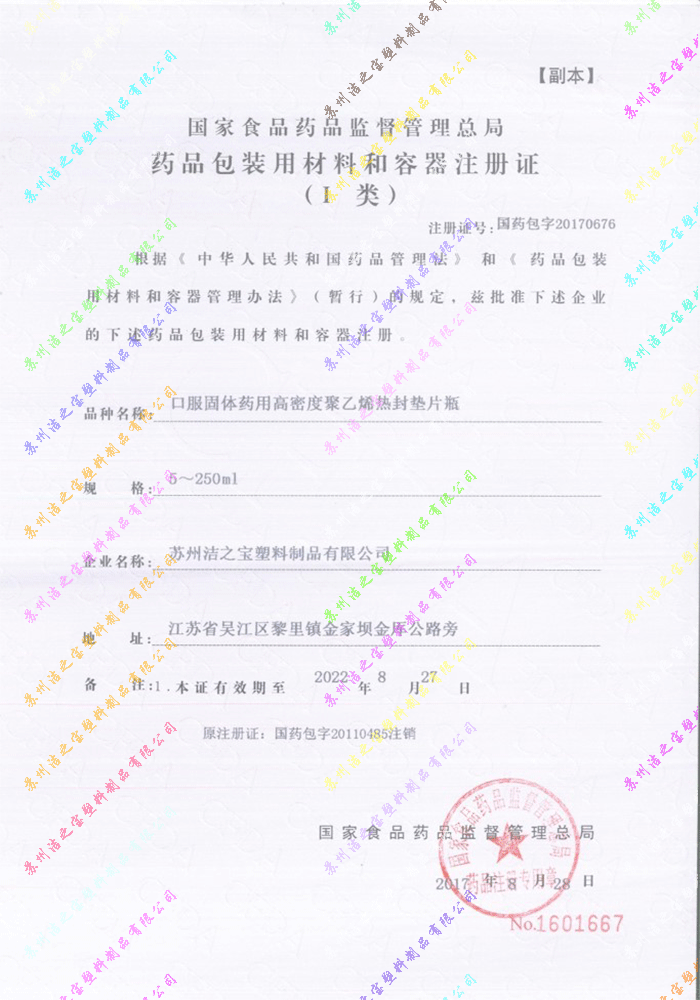 口服固體藥用高密度聚乙烯熱封墊片瓶注冊證